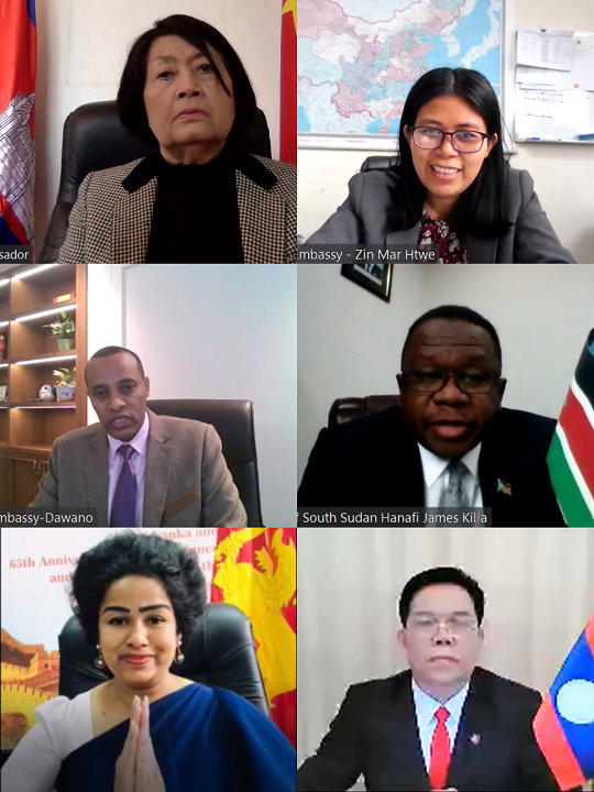 柬埔寨驻华大使西索达、埃塞俄比亚驻华使馆副馆长哈吉、缅甸驻华使馆公参杜欣玛泰、南苏丹驻华使馆代办哈那菲、老挝驻华使馆教育文化参赞彭文博、斯里兰卡驻华使馆二秘桑朱作为项目合作伙伴国代表,在发言中感谢了中国扶贫基金会、阿里巴巴公益以及中国社会公众对助减贫、促发展、增进民心相通、改善项目合作伙伴国社会经济情况做出的贡献,并对国际爱心包裹项目的开展表示大力支持,希望未来国际爱心包裹项目能继续在当地开展。