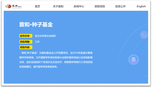 浙江敦和慈善基金会以“弘扬中华文化 促进人类和谐”为使命,秉持“尊道贵德”的价值观,深耕于文化传承、公益支持、慈善文化等领域的资助工作。其中,“敦和·种子基金”已成为这个领域最为知名的品牌。
