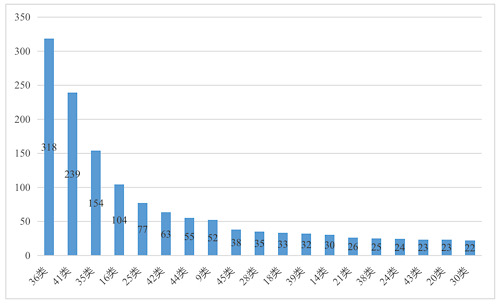 申请商标在10件及以上的机构共有33家,占到总申请机构数量的22%,申请商标量共有1335件,占到申请商标量的79.6%。从这里也能看出非常符合二八定律。