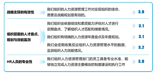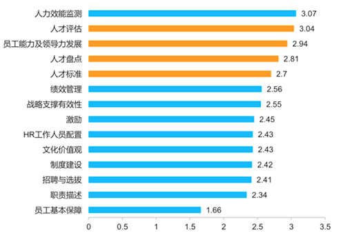 所有选项中,提升紧迫性指数超过3分“急待提升”的有一项:人才评估(3.04分),“期待提升”三项:人力效能监测(3.07分)、员工能力及领导力发展(2.94分)、人才盘点(2.81分)。位列第五的是人才标准(2.70分),虽未到期待提升,但高于其他选项。