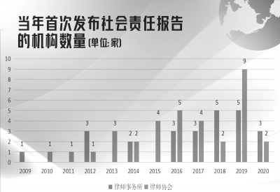 在社会责任报告方面(以下为不完全统计),国浩律师事务所于2009年发布了第一份律所社会责任报告,更多律所紧随其后:2012年有3家、2014年有2家、2016年有3家、2017年有3家、2018年有5家、2019年有5家、2020年有3家,总计25家。律师协会也积极发布社会责任报告:最早是北京律师协会在2010年发布,随后是全国律师协会,上海、浙江、陕西、广东、福建等16个省市级律师协会和南通、榆林、厦门等17个地级市律师协会也相继发布,至少34家律协发布了社会责任报告。