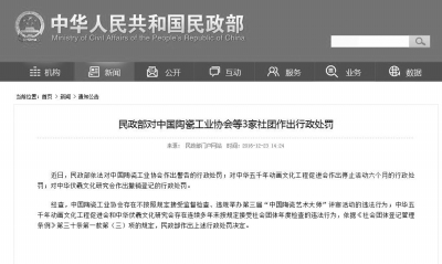 去年7月,中国陶瓷工业协会主办的第三届“中国陶瓷艺术大师”评审活动,评选出91名“中国陶瓷艺术大师”。5个月后,民政部将此次评审活动定性为“违法行为”,并作出警告的行政处罚。