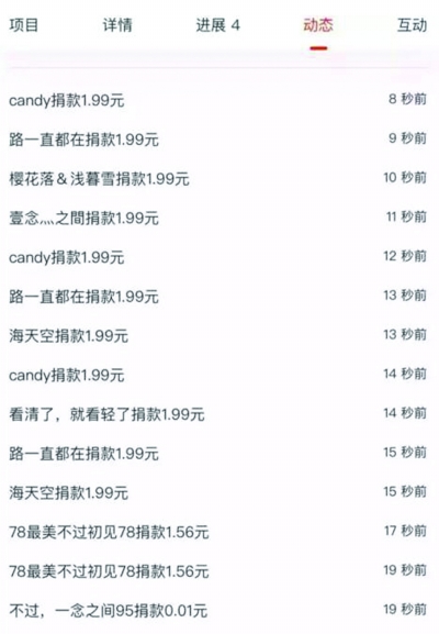 深夜3点还在不断出现的低额捐赠,而该项目捐赠栏中并没有“1.99元”的默认选项,也无法在其中直接输入小数点