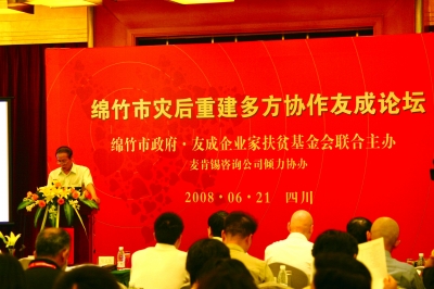 2008年5月12日,友成基金会成立一周年。虽2007成立基金会之初的战略规划中不包括救灾,出于本能的人道主义关怀,友成参与救灾。地震次日抵达灾区后现场发现有很多应急需求出现。此时,民间组织与政府之间应该呈现出一种怎样的合作成为基金会思考的问题。为此,基金会推出了志愿者协调办公室和社会资源协调平台,引入专家资源、企业和研究者,让其达成一种合作模式。最终,四川绵竹搭建起了政社合作模式,在2013年芦山地震救灾时也产生了积极的示范作用。