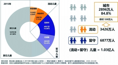 第一,亲子分离。截至2015年底,1.03亿受人口流动影响的儿童中只有33.25%(3426万)的儿童能够来到父母的工作地居住,其中只有1542万的儿童能够跟父母双方一起居住。
