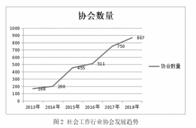 社会工作行业协会数量增幅明显。截至2018年底,全国34个省级、241个地市级、592个县级社会工作行业协会共计867个,较2017年增加了14.7%。