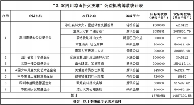 根据《公益时报》记者统计,截至5月7日17时,针对“3·30凉山森林火灾”英雄募捐,共有7家社会组织(深圳壹基金公益基金会、四川省红十字基金会、北京平澜公益基金会、中国少年儿童文化艺术基金会、中华思源工程扶贫基金会、深圳市建辉慈善基金会、中国妇女发展基金会)在民政部指定的20家公开募捐信息平台中的7家(腾讯公益、善源公益、水滴公益、轻松公益、阿里巴巴公益、蚂蚁金服、帮帮公益)平台上发起11个募款项目。按已筹款结束和未筹款结束来计算,计划募款额为15750851元,已募款14827320.58元。