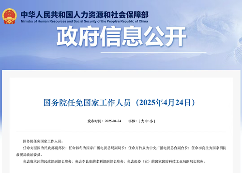 据人力资源和社会保障部网站24日消息,国务院任免国家工作人员。