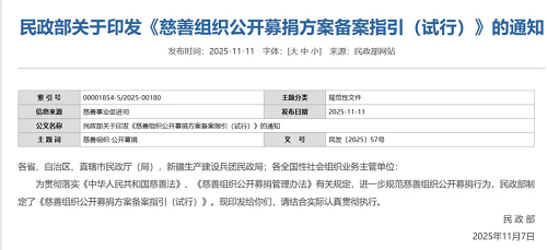 为进一步规范慈善组织公开募捐方案备案工作,提高公开募捐方案备案表填报质量,11月11日,民政部官网发布《慈善组织公开募捐方案备案指引(试行)》(以下简称《指引》),自2026年1月1日起施行。