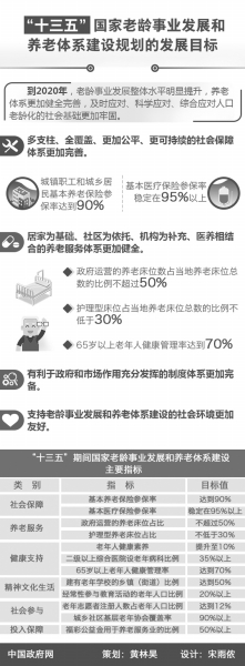 为应对老龄化问题,《规划》提出了发展目标:到2020年,老龄事业发展整体水平明显提升,养老体系更加健全完善,及时应对、科学应对、综合应对人口老龄化的社会基础更加牢固。