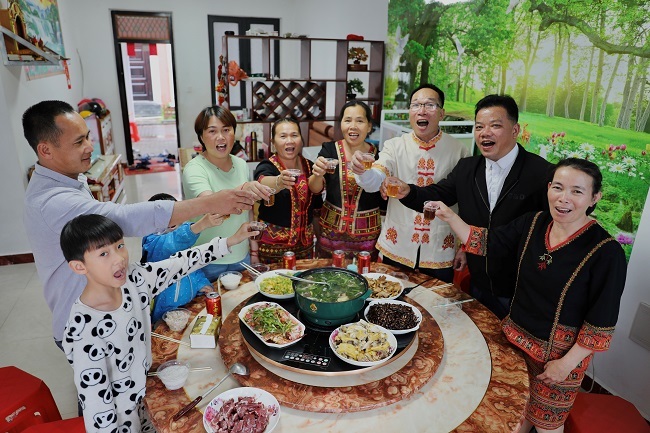走进海南省白沙县牙叉镇新高峰村生态搬迁村,大红的灯笼高高挂起,崭新的春联蕴含着新年心愿。村民符国华全家围聚在一起,吃上了一顿幸福的团圆饭。