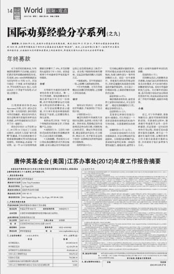 唐仲英基金会(美国)江苏办事处(2012)年度工作报告摘要