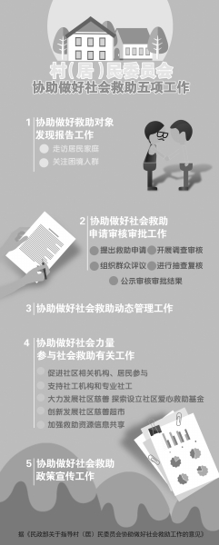 6月初,民政部发布《关于指导村(居)民委员会协助做好社会救助工作的意见》。《意见》提出,要指导、督促村(居)民委员会协助做好社会力量参与社会救助有关工作,积极促进社区各类力量参与社会救助,为社会工作服务机构和专业社会工作者进入社区创造条件,大力发展社区慈善,鼓励、支持社会组织、企事业单位和爱心人士等针对困境家庭和救助对象开展慈善救助,加强社区救助资源信息共享。 困难群众在社区 《意见》指出,困难群众居住在社区、生活在社区、服务依托社区,因此健全完善社会救助经办服务体系,落实好各项社会救助政策,不断提升基层社会救助服务水平,真正为困难群众排忧解难,离不开村(居)民委员会的参与、协助和配合。 社会救助与社区居民利益息息相关,是社区公共服务不可或缺的重要方面,同时村(居)民委员会也最了解困难群众的生活状况和救助需求。 《意见》强调,各级民政部门要指导村(居)民委员会根据辖区幅度、人口规模等因素,安排必要的人员协助做好社会救助工作。切实加强经费保障,将村(居)民委员会协助做好社会救助工作所需经费纳入社会救助工作经费统筹考虑,并按照“费随事转”原则,适当给予经费补助。要加强社会救助管理信息系统与社区综合信息管理服务平台的对接,实现社会救助对象数据和社区居民数据统一采集、多方共享。各级民政部门要有针对性地加强培训工作,确保村(居)民委员会相关工作人员熟悉、掌握社会救助政策与社会工作专业理念、方法和技巧。 《意见》还要求抓紧研究政府购买社会救助服务的机制、路径和办法,不断创新村(居)民委员会协助做好社会救助工作的模式、方法。探索将社会组织引入社会救助,逐步拓展社会救助服务内涵,积极指导村(居)民委员会以社区为平台,统筹整合政府救助、慈善救助和社会服务等资源,实施形式多样的救助服务,最大程度满足困难群众的救助需求。 协助做好救助对象发现报告工作 在民政部门的指导下,村(居)民委员会在社会救助方面要协助完成哪些工作呢? 首先,救助对象的发现报告工作责无旁贷。 《意见》提出,村(居)民委员会应该将发现排查困难群众列为日常重点工作,安排社区工作者、专业社会工作者、志愿者等经常性走访居民家庭,了解、收集困难群众的现状信息,掌握、核实辖区内居民生活困难及遭遇突发事件、意外事故、罹患重病等急难情况,并及时告知乡镇人民政府(街道办事处)。指导、督促村(居)民委员会在日常工作中,将辖区内的留守儿童、独居老人、残疾人、重病患者等易陷入生活困境的人群作为重点,开展经常性走访、问候;关注居住在本辖区的外来人员,帮助有困难的家庭和个人提出救助申请。指导有条件的村(居)民委员会在社区公共服务场所开设救助咨询服务窗口,开通救助服务热线,方便困难群众求助。 协助申请审核审批工作 一是协助提出救助申请。指导、督促村(居)民委员会接受申请最低生活保障、特困人员供养、医疗救助、教育救助、住房救助、临时救助等社会救助的有困难的家庭或个人的委托,代其向乡镇人民政府(街道办事处)或相关救助机构提交书面申请及材料。指导、督促村(居)民委员会将申请人所有申请材料全部上交,不得自行做出不予受理或不符合救助条件的决定。要指导、督促村(居)民委员会成员及其他社区工作者主动申报备案其近亲属申请救助的情况。 二是协助开展调查审核。指导、督促村(居)民委员会协助乡镇人民政府(街道办事处),组织驻村(社区)干部、社区救助专干、专业社会工作者等工作人员,通过入户调查、邻里访问等形式,对社会救助申请人声明的家庭经济状况、人口状况、遭遇困难类型等逐一调查核实,并由调查人员和申请人签字确认。调查审核的责任主体是乡镇人民政府(街道办事处),村(居)民委员会不能自行做出调查审核结论。 三是协助组织群众评议。指导、督促村(居)民委员会在入户调查结束后,协助乡镇人民政府(街道办事处)组织村(居)民代表或者群众评议小组对救助申请人声明的家庭收入、财产状况以及入户调查结果的客观性、真实性和完整性进行评议。 四是协助进行抽查复核。县级民政部门要在村(居)民委员会的参与下开展抽查复核工作,全面、准确地听取村(居)民委员会关于入户调查、邻里访问、群众评议以及村(居)民委员会成员等社区工作人员近亲属申请救助备案等情况介绍。有条件的地方,县级民政部门可邀请乡镇人民政府(街道办事处)、村(居)民委员会参与审批。 五是协助公示审核审批结果。乡镇人民政府(街道办事处)根据家庭经济状况调查审核、群众评议等情况对救助申请提出审核意见后,要在村(居)民委员会协助下在村(居)务公开栏公示审核结果。县级民政部门作出救助批准决定后,要在村(居)民委员会协助下在村(居)务公开栏公示拟救助的申请人姓名、家庭成员、救助金额等信息。两次公示的责任主体分别是乡镇人民政府(街道办事处)和县级民政部门,村(居)民委员会不能自行公示相关信息。要指导村(居)民委员会及时维护公示栏,确保相关公示信息完整、可视。 协助做好动态管理工作 各地民政部门要指导、督促村(居)民委员会配合乡镇人民政府(街道办事处)以及县级社会救助管理部门,按照有关规定分类、定期核查辖区内已获得救助对