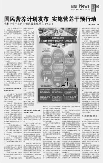 ■ 本报记者 王勇 7月13日,国务院办公厅发布了《国民营养计划(2017—2030年)》。计划提出了国民营养工作2020年和2030年分别要达到的目标。 到2020年,5岁以下儿童贫血率控制在12%以下;0—6个月婴儿纯母乳喂养率达到50%以上;5岁以下儿童生长迟缓率控制在7%以下;,缩小城乡学生身高差别…… 到2030年,5岁以下儿童贫血率和孕妇贫血率控制在10%以下;5岁以下儿童生长迟缓率下降至5%以下;0—6个月婴儿纯母乳喂养率在2020年的基础上提高10%;进一步缩小城乡学生身高差别…… 为实现这些目标,计划提出了六项重大行动:生命早期1000天营养健康行动、学生营养改善行动、老年人群营养改善行动、临床营养行动、贫困地区营养干预行动、吃动平衡行动。 计划还提出要充分发挥营养相关专业学术团体、行业协会等社会组织,以及企业、个人在实施国民营养计划中的重要作用,推动社会各方良性互动、有序参与、各尽其责,使人人享有健康福祉。 农村中小学生生长迟缓率 保持在5%以下 为贯彻落实《“健康中国2030”规划纲要》,提高国民营养健康水平,《国民营养计划(2017—2030年)》提出了一系列目标,主要包括: 到2020年,营养法规标准体系基本完善;营养工作制度基本健全,省、市、县营养工作体系逐步完善,基层营养工作得到加强;食物营养健康产业快速发展,传统食养服务日益丰富;营养健康信息化水平逐步提升;重点人群营养不良状况明显改善,吃动平衡的健康生活方式进一步普及,居民营养健康素养得到明显提高。实现以下目标: ——降低人群贫血率。5岁以下儿童贫血率控制在12%以下;孕妇贫血率下降至15%以下;老年人群贫血率下降至10%以下;贫困地区人群贫血率控制在10%以下。 ——孕妇叶酸缺乏率控制在5%以下;0—6个月婴儿纯母乳喂养率达到50%以上;5岁以下儿童生长迟缓率控制在7%以下。 ——农村中小学生的生长迟缓率保持在5%以下,缩小城乡学生身高差别;学生肥胖率上升趋势减缓。 ——提高住院病人营养筛查率和营养不良住院病人的营养治疗比例。 ——居民营养健康知识知晓率在现有基础上提高10%。 到2030年,营养法规标准体系更加健全,营养工作体系更加完善,食物营养健康产业持续健康发展,传统食养服务更加丰富,“互联网+营养健康”的智能化应用普遍推广,居民营养健康素养进一步提高,营养健康状况显著改善。实现以下目标: ——进一步降低重点人群贫血率。5岁以下儿童贫血率和孕妇贫血率控制在10%以下。 ——5岁以下儿童生长迟缓率下降至5%以下;0—6个月婴儿纯母乳喂养率在2020年的基础上提高10%。 ——进一步缩小城乡学生身高差别;学生肥胖率上升趋势得到有效控制。 ——进一步提高住院病人营养筛查率和营养不良住院病人的营养治疗比例。 ——居民营养健康知识知晓率在2020年的基础上继续提高10%。 ——全国人均每日食盐摄入量降低20%,居民超重、肥胖的增长速度明显放缓。 开展贫困地区营养干预等 多项重大行动 为实现上述目标,计划提出了多项重大行动,其中有不少是社会组织应该关注和可以参与的。 首先,生命早期1000天营养健康行动,主要包括: 开展孕前和孕产期营养评价与膳食指导。推进县级以上妇幼保健机构对孕妇进行营养指导,将营养评价和膳食指导纳入我国孕前和孕期检查。开展孕产妇的营养筛查和干预,降低低出生体重儿和巨大儿出生率。建立生命早期1000天营养咨询平台。 实施妇幼人群营养干预计划。继续推进农村妇女补充叶酸预防神经管畸形项目,积极引导围孕期妇女加强含叶酸、铁在内的多种微量营养素补充,降低孕妇贫血率,预防儿童营养缺乏。在合理膳食基础上,推动开展孕妇营养包干预项目。 提高母乳喂养率,培养科学喂养行为。进一步完善母乳喂养保障制度,改善母乳喂养环境,在公共场所和机关、企事业单位建立母婴室。研究制定婴幼儿科学喂养策略,宣传引导合理辅食喂养。加强对婴幼儿腹泻、营养不良病例的监测预警,研究制定并实施婴幼儿食源性疾病(腹泻等)的防控策略。 其次,学生营养改善行动,主要包括: 指导学生营养就餐。鼓励地方因地制宜制定满足不同年龄段在校学生营养需求的食谱指南,引导学生科学营养就餐。制定并实施集体供餐单位营养操作规范。 学生超重、肥胖干预。开展针对学生的“运动+营养”的体重管理和干预策略,对学生开展均衡膳食和营养宣教,增强学生体育锻炼。加强对校园及周边食物售卖的管理。加强对学生超重、肥胖情况的监测与评价,分析家庭、学校和社会等影响因素,提出有针对性的综合干预措施。 开展学生营养健康教育。推动中小学加强营养健康教育。结合不同年龄段学生的特点,开展形式多样的课内外营养健康教育活动。 再次,老年人群营养改善行动,主要包括: 开展老年人群营养状况监测和评价。依托国家老年医学研究机构和基层医疗卫生机构,建立健全中国老年人群营养筛查与评价制度,编制营养健康状况评价指南,研制适宜的营养筛查工具。试点开展老年人群的营养状况监测、筛查与评价工作并形成区域示范,逐步覆盖全国80%以上老年人群,基本掌握我国老年人群营养健康状况。 建立满足不同老年人群需求的营养改善措施,促进“健康老龄化”。依托基层医疗卫生机构,为居家养老人群提供膳食指导和咨询。出台老年人群的营养膳食供餐规范,