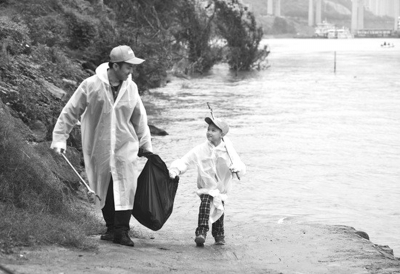 10月13日,参加“益起爱河”水资源保护公益活动的一对父子在重庆嘉陵江边清理垃圾。当日,“益起爱河”水资源保护公益活动在重庆正式启动。活动旨在通过河道清理、城市水源工程探访、湿地保护区调研等行动,号召更多社会人士投身于水资源生态保护工作。