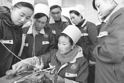 甘肃省临夏回族自治州东乡族自治县大树乡“扶贫车间”近日投入使用,40多名留守妇女在家门口实现就业。今年以来,共青团临夏州委积极争取东西协作城市厦门市的支持,建立“扶贫车间”。图为大树乡“扶贫车间”内,当地员工向熟练工(中)学习操作技巧。 新华社记者 范培珅/摄