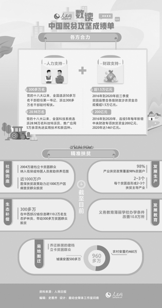 ‘历经8年,现行标准下近1亿农村贫困人口全部脱贫,832个贫困县全部摘帽。’ 新年前夕,国家主席习近平在新年贺词中全面回顾了‘极不平凡’的2020年。扶贫话题已经连续第七次出现在他的新年贺词中,而这次,意义尤为不同。 其作始也简,其将毕也必巨。 回顾决战脱贫攻坚的伟大征程,每一个脚步都踏出奋斗和拼搏,每一帧风景都写满美好和希望。 较真碰硬 一鼓作气啃下“硬骨头” 冬日暖阳下,贵州省望谟县乐旺镇坡头村村民唐守芬脸上洋溢着幸福的笑容。 “家门口有钱挣,天天都是好日子喽!”唐守芬高兴地告诉人民日报记者,去年她和老伴靠着在花椒种植基地干活,全家脱了贫,越来越有干劲。 与唐守芬家一起脱贫的,还有坡头村的28户村民。山多地少,坡头村一度是深贫村。为了攻下深贫堡垒,去年县里实施挂牌督战,村里成立了农民专业合作社,选定花椒为长线“大”产业,并搭配短平快“小”产业,还引进了龙头企业提供花椒技术服务。一年奋战下来,脱贫户人均纯收入超过1.1万元,稳住了全村增收脱贫的“基本盘”。 2020年11月23日,贵州省宣布包括望谟县在内的剩余9个贫困县退出贫困县序列,至此我国832个贫困县全部宣布脱贫。 这是一份沉甸甸的、兑现承诺的发展答卷。决胜之年,开局就是决战,起步就是冲刺。2020年3月6日,在决战决胜脱贫攻坚座谈会上,习近平总书记发出了总攻令—— “要继续聚焦‘三区三州’等深度贫困地区,落实脱贫攻坚方案,瞄准突出问题和薄弱环节狠抓政策落实,攻坚克难完成任务。” “对52个未摘帽贫困县和1113个贫困村实施挂牌督战,国务院扶贫开发领导小组要较真碰硬‘督’,各省区市要凝心聚力‘战’,啃下最后的硬骨头。” ——加大资金支持和工作指导力度。疫情下,资金支持不降反增,2020年中央财政专项扶贫资金达到1461亿元。此外,还一次性安排脱贫攻坚补短板资金300亿元,重点支持补齐因疫情导致的财政减收,完成剩余贫困人口脱贫任务,做好贫困劳动力就业和产销对接工作等。 ——强化督战一体,帮助基层解决实际困难和问题。截至2020年7月底,52个挂牌县15.6万贫困人口的饮水安全、住房安全、义务教育和医疗卫生保障方面的问题得到解决;截至2020年10月底,90%以上建档立卡贫困人口得到了产业扶贫和就业扶贫支持,全国外出务工贫困劳动力2973万人,已超2019年全年。截至2020年12月,剩余的40万贫困搬迁群众各地已完成相关退出工作,“十三五”时期易地扶贫搬迁任务全面完成。 ——发动社会力量,助力挂牌村脱贫攻坚。东中部11省(市)共组织动员1937家社会力量与挂牌督战村建立结对关系,实现对1113个挂牌督战村结对帮扶全覆盖。 …… “中国的减贫密码,用一句话概括就是:加强领导是根本、把握精准是要义、增加投入是保障、各方参与是合力、群众动力是基础。这些都是我们在波澜壮阔的脱贫攻坚实践中形成的有益经验。”国务院扶贫办主任刘永富说。 尽锐出战 凝心聚力答好“民生卷” 全面打赢脱贫攻坚战的收官之年,本来就有不少硬骨头要啃,又遇新冠肺炎疫情,这场硬仗怎么打? “疫情或灾害对减贫进程会产生影响。我们必须采取有效措施,将疫情的影响降到最低。” 落实分区分级精准防控策略、优先支持贫困劳动力务工就业、解决扶贫农畜牧产品滞销问题、支持扶贫产业恢复生产、加快扶贫项目开工复工……在决战决胜脱贫攻坚座谈会上,习近平总书记就如何统筹推进疫情防控和脱贫攻坚开出“药方”。 一个多月后,习近平总书记的身影出现在秦岭深处的陕西省柞水县小岭镇金米村。在村里的木耳展销中心直播台前,习近平总书记对着手机镜头点赞——“小木耳、大产业”。据媒体报道,当晚,2000万网友涌进直播间,20多吨木耳秒光。 产业扶贫是啃下脱贫攻坚硬骨头的重要举措,消费扶贫行动则是带动产业可持续发展的有效方式。回顾过去一年,我国中西部22个省份组织认定扶贫产品16万多个,全年扶贫产品销售额达到3069.4亿元。 夏季的洪涝灾害又带来一轮“加试”,绝不能让洪涝灾害造成返贫致贫。保民生所需,是当务之急。 2020年8月18日,正在安徽省考察调研的习近平总书记来到阜南县的红亮箱包扶贫车间察看生产线,同职工面对面交流,了解阜南县开展就业扶贫和防止因灾致贫返贫情况。 红亮箱包有限公司是当地返乡人士创办的扶贫车间,员工中有约一半为建档立卡的贫困人口。由于当地开闸蓄洪、工人受困,工厂停工15天,造成损失20多万元,但给员工的补贴仍然坚持发放。 总书记要求,各级党委和政府加大扶持力度,帮助企业渡过难关,保障受灾群众、贫困群众就业。 面对总书记的深深牵挂和殷殷嘱托,阜南县及时制定方案及救助政策,对受灾农民和经营大户,给予相关财政支持、金融支持;开发一批公益性岗位,吸纳958名贫困人口就近就业;提前拨付救助资金598.6万元,对困难群众实施临时生活救助。经统计,全县未出现贫困群众因灾返贫致贫情况。 打胜疫情防控阻击战、打赢抗洪救灾攻坚战、打好经济发展推进战,以习近平同志为核心的党中央带领全党全国各族人民不畏艰险、勇往直前,巩固了脱贫成果,涵养了小康“成色”。 统筹衔接 跑好乡村振兴“接力赛” 这一年,一个个贫困村华丽蜕变,变成宜居“新家园”; 这一年,一个个特色产业拔节生长,鼓起农民“钱袋子”; 这一年,中国