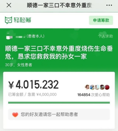 两家人、同一车出行,不料遭遇汽车起火意外事故。日前,广东佛山两条来自轻松筹的筹款链接很快吸引数十万人捐款,两个遭遇不测的家庭600万元的筹资目标迅速完成。 在大家接力“慷慨解囊”的同时,一些质疑的声音也开始出现。对此,记者采访当事人家属及平台,对这一事件进行调查。 两家人同车出行 遭遇意外事故被烧伤 8月9日晚,一条名为“顺德一家三口不幸意外重度烧伤生命垂危,恳求您救救我孙女一家”的第三方筹款链接,刷爆了广东省佛山市顺德区的市民朋友圈。 “看着可爱的孙女躺在病床上奄奄一息的样子,我的心就像被刀切碎了一样。”发起求助的,是其中一位女性伤者的父亲。 这位父亲称,今年8月8日中午1时,女儿一家在乘车中突然意外遭遇火灾造成特重度烧伤,随后送到了医院抢救。 求助链接放上了其女儿、女儿丈夫及孙女的烧伤治疗照。病床上的伤者全身包裹着绷带。链接上,发起求助者还公布了一家人的伤情,并晒出了医院相关诊断书。其女儿何某全身多处特重度烧伤90%,孙女全身多处特重度烧伤85%,其女婿梁某则是头部、四肢重度烧伤40%,伤情严重。 值得关注的是,在链接发出后当晚,数小时400万元款项就筹集完毕。 同车遭遇意外烧伤的还有另一家人。第二天(8月10日)傍晚,这一家人的筹资救助的链接也开始出现在市民的朋友圈上。据悉,其筹资目标为200万元。 发起救助的是伤者之一的父亲。他称,其儿子一家与另一家是“开着借用的车”出行,随后突然出现意外(交警和消防正在调查起火事故原因)。“仅仅几秒钟时间车厢里满是火焰,儿子到第三排抱着我的小孙女拖着儿媳下车,孙女在爸爸的保护下面部、手臂和腿部也均有轻度烧伤,但夫妻两人却被大火包围造成重度烧伤,所乘车辆也被烧成了空架子。” 链接上,求助者也放出了一家的救治照片,附上了诊断证明。据悉,这一家男性伤者徐某全身各处重度烧伤50%,其妻子卢某全身重度烧伤30%。而经过一晚上,200万元善款也筹资完成。 关于家庭财产 “我说得实事求是” 接连两天,佛山全社会为两个家庭共筹资超过600万元。记者了解到,在大家接力“慷慨解囊”的同时,关于伤者家庭真实情况等一些质疑的声音开始出现。 针对质疑,10日,轻松筹平台上更新了一份关于伤者家庭财产情况的证明。记者看到,在证明文末的一行“经核实,该家庭为我社区非低保家庭,非低保临界家庭”手写字样上,盖上了伤者梁某所在居委会印章。 证明还提及了伤者梁某夫妻在北滘坤洲开设一间加工作坊,有一幢自建房,有一台小轿车等。 对此,记者也第一时间就该份证明向盖章单位进行核实。据其所在的碧江村委会相关负责人介绍,该证明确实是经居委会之手。 8月11日,记者找到了遭遇事故家庭之一伤者梁某的亲哥哥。他回应称,对于网上提及的一些质疑声音,自己实话实说,“光明正大”。 “我弟弟的情况全都是真实的。”梁某的哥哥还表示,关于一些质疑的声音,自己暂时无暇顾及。当务之急要筹资救人,让家人脱离危险。“出现这样的变故,谁都不愿意接受。” 关于治疗费用 “做好了卖房的准备” 梁某的哥哥透露,当前弟弟一家暂未脱离生命危险。近段时间来,除安抚、陪伴伤者家庭,他还奔走在保险公司、社保部门等,争取更多权益。 因为不在急救第一现场,梁某哥哥表示对上众筹平台一事了解不多,但也就缘何筹资400万元进行了回应。 他称,据收治其弟媳的广州市红十字会医院给出的治疗方案,全部治疗费用“保底”也要200万元。“弟弟和侄女在南方医院,现在还没脱离危险期,医院表示还无法给出具体的治疗费用。但是我坦诚说,400万元肯定是不够的。” “我们已经做好准备了,将全部身家都拿出来,用来救人。”梁某哥哥回应记者,一家人已经做好了“最坏打算”。“要先把我弟的房子卖了,如果还不够的话,就把我爸的一个房子拿出来卖了,现在已经做好这样的准备了。”他还表示,目前一家人也在等待事故原因的查明。 该筹款链接也发出了新的筹款动态。其中上传了三名患者费用诊断证明,表示前期合计320万元费用缺口。 平台回应 已触发“风控机制” 在众筹过程中,不少网友也对平台提出质疑,包括材料审核、筹款修改等。 8月10日,轻松筹平台经过内部调查,并通过采访函回复记者,此次顺德烧伤家庭的筹款事宜,是轻松筹筹款顾问在医院遇到了发起人,在发起人表达对筹款有需求后,其对项目发起的步骤及所需材料进行了辅导。 那么,在该起求助信息中,平台对于求助人的伤情,以及家庭背景做了哪些调查工作? 平台表示,根据《自律公约2.0》的规定,平台要求发起人按平台规定,提交发起人及求助人身份信息、医疗机构开具的医疗证明等真实材料,并对材料进行形式审核。平台严格按照《自律公约》执行。另外,平台积极与求助人进行沟通,提供必要的盖章证明材料。 平台表示,这一求助信息不存在“文案代笔”的情况。“在该项目中发起人年龄比较大,打字方面有很大的困难。筹款顾问协助发起人进行发起,所有项目内容均由发起人确认后发出。” 最为争议的是,该笔筹款从一开始的150万元,调整到300万元,然后在短时间内筹集到目标后,又进一步扩大至400万元。有网友质疑筹款目标“可随意调整”。对此,平台回应称,此举是根据医院给到的费用预估,调整筹款金额。“后续会更新由医院