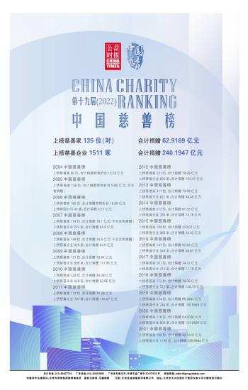 上榜慈善家135位(对),合计捐赠62.9169亿元 2004中国慈善榜 上榜慈善家50位,合计捐赠款物折合10.29亿元 2005中国慈善榜 上榜慈善家136位,合计捐赠款物折合9.85亿元(含实物捐赠) 2006中国慈善榜 上榜慈善家162位,合计捐赠款物折合15.89亿元 上榜跨国公司42家,合计捐赠4.27亿元 2007中国慈善榜 上榜慈善家174位,合计捐赠19.1亿元(不含实物捐赠) 上榜慈善企业222家,合计捐赠54.9亿元 2008中国慈善榜 上榜慈善家149位,合计捐赠16.5亿元(不含实物捐赠) 上榜慈善企业325家,合计捐赠54.9亿元 2009中国慈善榜 上榜慈善家121位,合计捐赠18.84亿元 上榜慈善企业899家,合计捐赠117.95亿元 2010中国慈善榜 上榜慈善家133位,合计捐赠34.38亿元 上榜慈善企业448家,合计捐赠52.95亿元 2011中国慈善榜 上榜慈善家173位,合计捐赠74.28亿元 上榜慈善企业707家,合计捐赠116.07亿元 2012中国慈善榜 上榜慈善家231位,合计捐赠79.99亿元 上榜慈善企业605家,合计捐赠104.47亿元 2013中国慈善榜 上榜慈善家311位,合计捐赠70.99亿元 上榜慈善企业627家,合计捐赠94.45亿元 2014中国慈善榜 上榜慈善家212位,合计捐赠61.33亿元 上榜慈善企业760家,合计捐赠74.75亿元 2015中国慈善榜 上榜慈善家199位,合计捐赠219.02亿元 上榜慈善企业360家,合计捐赠54.32亿元 2016中国慈善榜 上榜慈善家147位,合计捐赠52.63亿元 上榜慈善企业349家,合计捐赠48.67亿元 2017中国慈善榜 上榜慈善家201位,合计捐赠74.12亿元 上榜慈善企业414家,合计捐赠71.15亿元 2018中国慈善榜 上榜慈善家172位,合计捐赠76.08亿元 上榜慈善企业721家,合计捐赠120.79亿元 2019中国慈善榜 上榜慈善家274位,合计捐赠95.3834亿元 上榜慈善企业744家,合计捐赠180.9469亿元 2020中国慈善榜 上榜慈善家118位,合计捐赠54.5036亿元 上榜慈善企业605家,合计捐赠124.0590亿元 2021中国慈善榜 上榜慈善家105位,合计捐赠40.1010亿元 上榜慈善企业1108家,合计捐赠226.9964亿元 |