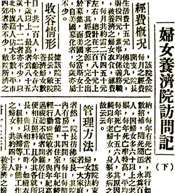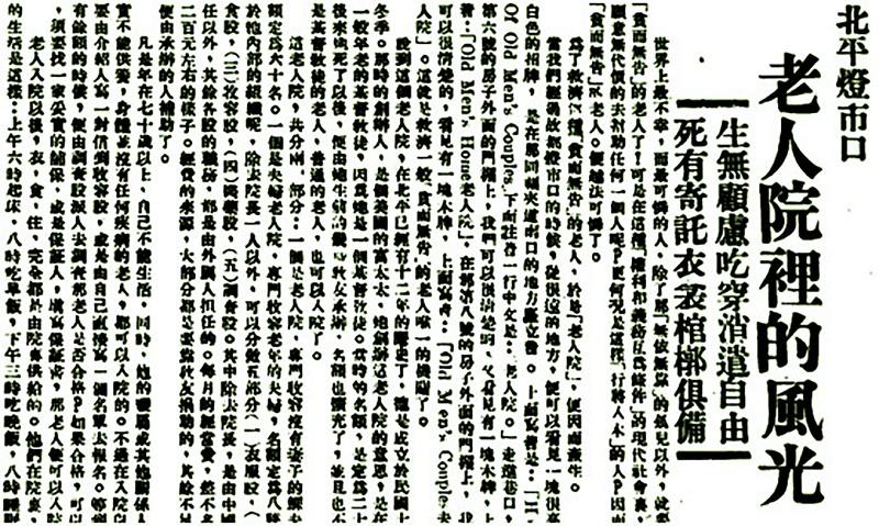 20世纪30年代,由于养老金和退休制度尚未普遍建立、战争及灾害频繁,北平市老年贫民的流离失所、孤苦无依逐渐成为一个社会问题。如果说以往对于老年贫民的社会救济带着浓厚的“施惠”“怜民”色彩,那么20世纪30年代的养老救济则开始具备一定的政府责任意识。北平市社会局救济院与民间力量发起的各种养老院所相辅相成,成为由传统社会向现代福利社会转型过程中社会养老救济实践不可或缺的参与主体。尽管由于受到社会历史条件的局限,这一时期的养老救济事业还存在着种种缺陷,但其对维持社会秩序、保障战乱时的民生还是有一定的促进作用。 官办救济院成立残老组 与此前主要以民间力量兴办的善堂善会为主的救济设施构成相比,这一时期由北平市政府主导的救济设施有所增多,同时面向孤寡老人和残疾人等社会弱势群体的救济设施也开始趋于制度化。 一、残老组及其养老设施 1934年6月1日,经北平市政府批准,由原第一救济院、第二救济院、妇女救济院、第一习艺工厂、第二习艺工厂、乞丐收容所等处改组成立北平市社会局救济院,院址设于宣外教子胡同前第一救济院旧址,由龚齐振任院长。其下设工务股、事务股、营业股,统一管理北京社会救助事务,成为北平市政府救济机关正式建立的标志。1934年8月颁布的《北平市社会局救济院章程》规定了救济院救济对象,即市内贫苦残老及无依之男女儿童暨不愿为娼之妓女与被虐待之妇孺等。同时,救济院将前乞丐收容所改为残老组和感化组,“以原来之第一救济院改为北平市社会局救济总所,附设收容部,收容部下之感化、残老两组,仍设燕翅楼乞丐收容所原址”,提出“其残老者养之”,从而与其他救济机构得以区分开来,管理开始趋于规范。 残老组收养的老人,或无子女家人,或身体孱弱。为充实、方便老年人的生活,救济院内设教室、工作室、游戏场、寝室、食堂、浴室等生活设施。衣物上,收容老人衣着以蔽体、保暖、整洁为主。凡收容者,每年发给单、棉衣各一套,棉鞋、棉被各一双(套),棉袜一双;食物层面,则以能适合老年人咀嚼、果腹的清洁食物为主,并注意个别的营养。早餐有小米粥,午、晚两餐为玉米面窝头,佐以菜汤、咸菜。每周一、三、五早餐为白面馒头,逢年节增肉食一餐。患病者可以大米、白面调摄。与此同时,除了涵盖衣和食的“养”,“医”也是老年救济必不可少的要素。救济院设有养病室,“每春夏两季,为全体收容人员预防白喉、猩红热、霍乱等病注射,其有患重病及传染者,分别送入市立、中央、协和、传染等医院免费诊治”。此外,《北平市社会局救济院章程》第二十一条规定,收容人死亡,由院通知其家属备棺承领;其无家属者,由院棺殓抬埋。“随时电知第一股,然后由该股函请地方法院检察处派员检验,发给执照,购备棺木,饬役掩埋于本院墓地,树立石碣”。 二、收养程序 查阅北京市档案馆现存资料可以发现,孤苦无依的老年人经由“社会局票交收容”“各区属函送”“慈善团体介绍”“自投请求救济”“家属送请教养”五种渠道才可以进入社会局救济院。在救济收容程序上已具备了现代养老机构的特征和功能。 从北京市档案馆查阅的老年救济申请书及批复的公函件材料来看,1938年1月至12月期间,被收容的老人主要以女性为主,年龄分布最低者是50岁,最长者为80岁。“自投请求救济”者由请投者自行填写申请书,申请内容与实际情况相符并由社会局派出巡官核验合格后才能入救济院。例如,巡官杨永志奉派调查崔董氏呈请赴救济院收养一案,“遵即赴西城成方街西口外百子胡同五号系崔董氏之内侄董乃温之家寄居,调查该氏确系年老贫寒无力生活,情愿入院以求生活舖(铺)保,亦核对相符理合呈报”。“各区属函送”则由警察局发送公函致社会局转交救济院,“内一区警察署函送關(关)田氏年老无依请安置一案到局,訉据该氏供称孤身一人,仅有外孙女婿英姓住抽屉胡同曾供给伊生活。现其停止供给无所依附,请安置。”其他情形在此不再赘述。 三、“教养并施,老有所安”的管理方式 一方面,“救人救彻”这一救助理念开始在政府行动中得到一定贯彻而非局限于以往单纯发放衣物、贷款及开设粥厂和暖厂等此类临时性的救助行动。如提出“救济残老,并不在提供衣食,使有所终,就算尽了最大的义务,乃是如何使‘残而不废’‘老有所安’”等等。 另一方面则是由过去的“重养轻教”逐渐转向“教养并施”。救济院一般向老年人提供有益身心健康的课程,并根据体质情况设立操作室,实施技能调练,尽其所能予以生产操作,所得收益用以补助经费和改善老人生活;与此同时,注重“因材施教”及“因人施助”;年老人员也不用接受文化教育,仅要求每日接受管理人员训话,给予一定精神慰藉。对于因种种原因未能“悬镜婚配”成功的妇女,令其学习一门技艺以便谋生:“年老、丑陋,择配困难之妇女,现在收养者,为数亦不少,拟使彼等学习普通技能之外,专习某种工艺,以便将来得以糊口”。 私立养老院的补充发展 20世纪30年代北平市私立养老院类型大体上可分为两类:一类是由清朝开设的暖厂、粥厂演变而来的养济院,如公善养济院和利仁养济院(鉴于二者共同的创办背景、运营风格,且董事均为恽宝惠,故本文仅以公善养济院为案例进行分析)等;一类是由英美基