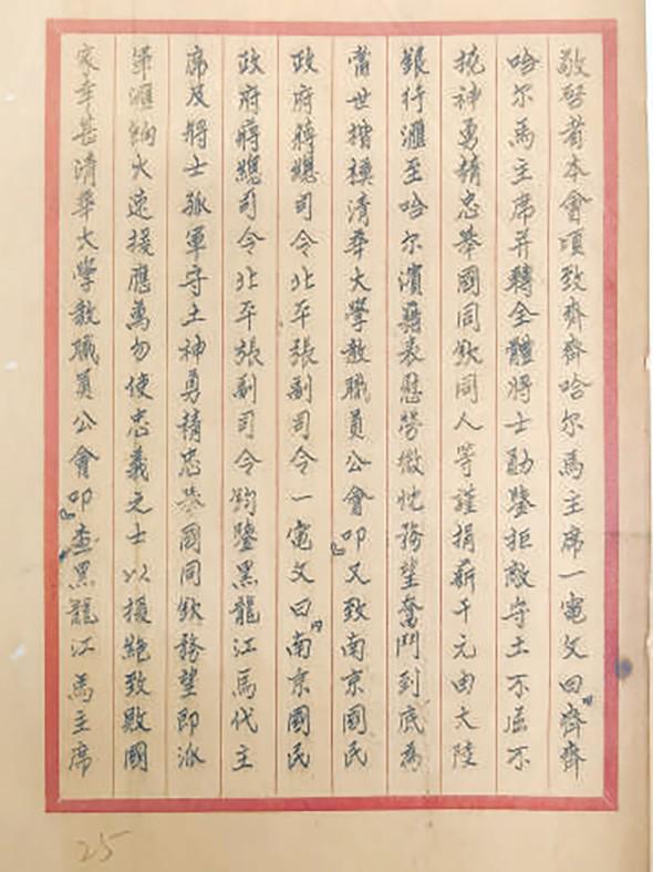 1931年,日本悍然发动九一八事变,中国人民不屈不挠的局部抗战,揭开了世界反法西斯战争的序幕。作为中国武装抗日的“第一枪”,江桥抗战宛如一声惊雷,在白山黑水间激民族之义愤,燃满腔之热血。北平各界同仇敌忾,通过声援、募捐等方式,表达对抗日志士的支持和守土卫国的决心。 临危受命江桥迎战关东军 初夏的清华园,万物葱茏、水木禽鸣,荷塘涟漪一圈圈荡开。礼堂前,“行胜于言”的石刻在阳光下熠熠生辉。 正值周末,入校游学的青少年络绎不绝,在标志美景前竞相留影。风华正茂的学子骑着车经过,衣角飘动,聚焦了人们钦羡的目光。 近百年前,以清华为代表的北平高校师生,同样以实际行动,成为全民抗战意识的引领者,正是“行胜于言”的无声写照。 1931年,九一八事变爆发后,日本侵略军一周内相继侵占辽、吉两省主要城市,并图谋进犯黑龙江省。黑河警备司令兼步兵第3旅旅长马占山临危受命,主持黑龙江军政。 “马占山在嫩江北岸至昂昂溪之间,构筑了三道防线。11月3日,日军两列铁甲车开赴嫩江桥,日军飞机向中国军队投掷炸弹。”北京市档案馆展陈处副处长刘静的讲述,令人感受到当时战况之激烈。“东北气温已低至严寒,马占山率领爱国官兵,以落后的武器、简陋的装备,迎战拥有飞机、大炮、坦克的日本关东军,喊杀声、刺刀撞击声震荡山野……半个月的时间,抵挡了日军一波接一波的攻击。” “男儿抗日死沙场,青史垂名姓字香。”江桥抗战的消息传到北平后,爱国学子热血沸腾,纷纷请缨要求北上抗日。与此同时,北平各界慷慨解囊,为抗日将士募集善款。其中清华大学发挥了先锋作用,该校教职员公会对日委员会捐薪千元,紧接着,由学生自治会迅速组织全校募捐活动。 慷慨解囊为将士募集善款 不仅自发筹措善款,清华大学教职员公会对日委员会还发函致北平大学工学院,邀对方对马占山进行一致声援。 很快,北平大学工学院也发出募捐慰劳马占山及诸将士的启事。刘静展开这份1931年11月27日的史料,其上载明“当此雪地冰天,前方爱国将士断头折臂,努力为国家争存亡之际,吾辈身在后方,未能先期赴国难,自当各尽职责,以表救国之意……”字里行间,尽显高校青年的报国情怀。 学界之外,各界群众也自发组织慰问团、后援会,捐款捐物,全力支持。刘静介绍,例如东北民众救国会,争取张学良以及国内各界人士、海外侨胞的资助,开展募捐和“义卖”,发行“爱国奖券”等,给黑龙江军民以极大的支持。 一封封书信、电报,记录下这段波澜壮阔的历史。1932年1月4日的《国立清华大学校刊》上,登载马占山将军给清华大学的复电,称:“承惠巨款,益励初衷。谨率部曲遥致谢忱。”而收到平津学术团体对日联合会发来的电报后,马占山更回复,“占山忝属军人,尤其责无旁贷,苟一息之尚存,岂虑孤军之苦战。”铿锵有力的表达,书就这位民族英雄的气节风骨,也掀开军民同仇敌忾,保家卫国的篇章。 奔走宣传直面“最残酷时代” 江桥抗战的壮举震动海内外,除捐款捐物,北平各界还广泛发起宣传活动。其中北平师范大学(现北京师范大学前身)师生表现活跃,组织了国立北平师范大学教职员对日外交后援会(后改称平津学术团体对日联合会师大分会)、北平师范大学抗日救国会等团体,分析抗战形势,揭露日本暴行。 如今的北京师范大学,地处车水马龙的北三环旁,徜徉校园,傍晚的风携来芬芳花香,耳畔荡起广播悠扬的乐曲。正是拍摄毕业照的时节,意气风发的年轻人三三两两,在古色古香的教学楼、京师学堂、校训石碑前,定格下青春的光影。 当年,也是这样年纪相仿的学子们,心怀大义,为民族存亡奔走呼号。据北师大校史研究室提供的资料,1931年10月26日,该校学生抗日救国会宣传队,曾赴长辛店机车厂演讲抗日救国,并散发《为日本帝国主义占领东三省告工友书》。 此外,北平师范大学抗日救国会还创办了《抗日周刊》,北京市档案馆所藏第二期,出版于1931年11月2日。末尾征稿启事疾呼:人类最残酷的时代已经降临到我们面前了!这种“残酷”“无理性”“暴戾”,逼迫着我们不得不负起这种重大的使命去奋斗,去拼命,去推倒一切的人压迫人的禽兽行为!并号召同学们努力投稿,“战胜一切的障碍,充实抗日的内容。” 刘静介绍,北平各界的全力支持,给了马占山将军抗战到底的动力。“江桥抗战更唤起中华民族的空前觉醒,作为中国人民抗日斗争的序曲,永载史册。” (据《北京晚报》) |