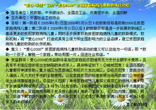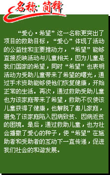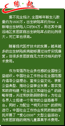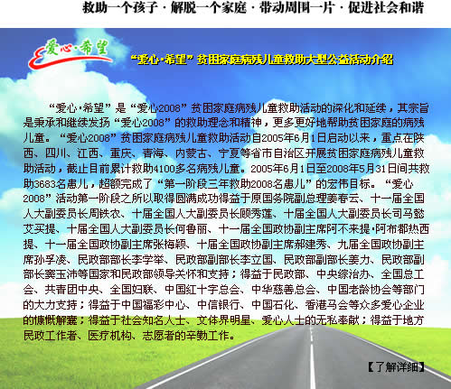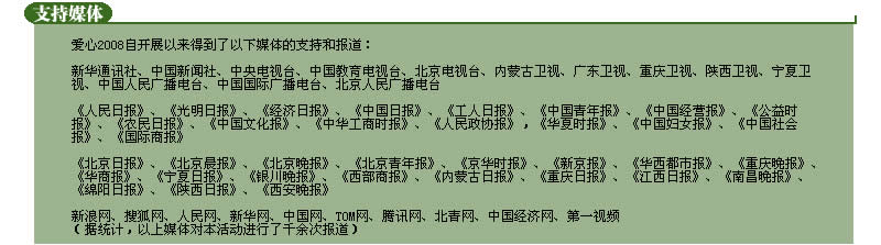 “爱心2008”活动自开展以来成功举办了“爱心2008—走进宁夏、重庆、内蒙古、江西、四川绵阳、陕西延安、广东潮州”启动仪式。 |