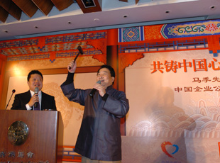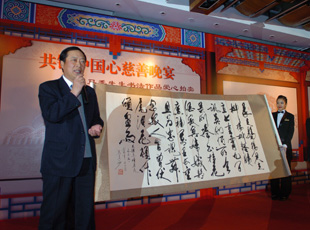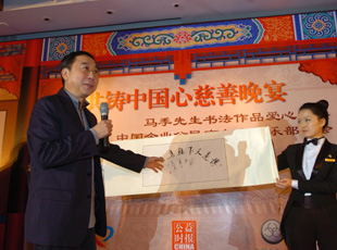 姜昆、冯巩、李金斗及公益时报社社长刘京等10人分别为十组拍品执锤。作为第一件拍卖品拍卖师的姜昆说,在马季离去5年之后,仍然能通过这种方式伸出援助之手,帮助那些需要帮助的患病孩子们,这件事情本身,是“闪着光芒,并且有时代意义”的。而他将尽其所能地将自己掌锤的拍品拍出个好的价格。相声曲艺界的各位名流大腕,轮流上台为慈善拍卖站台,这些业余拍卖师们说学逗唱的本领,引得笑声不断。最后一件拍品《蝶恋花 答李淑一》加紫檀笔筒,由宴会主办方公益时报社社长、中国企业公民高尔夫俱乐部主席刘京以及相声演员周炜担任拍卖师,最后江苏太阳雨太阳能集团董事长徐新建以45万元的价格胜出。将拍品募得的总善款凑成了整数200万。在现场浓烈气氛的感召下,徐新建又当场宣布向“共铸中国心”基金再另捐200万元。至此,马季书法作品拍卖慈善晚宴共为“共铸中国心”基金募得400万元善款。[详细]
