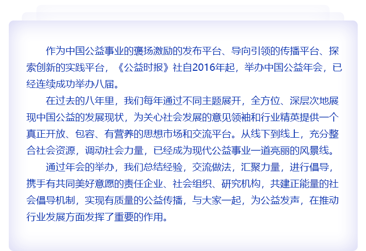 作为中国公益事业的褒扬激励的发布平台、导向引领的传播平台、探索创新的实践平台,《公益时报》社自2016年起,举办中国公益年会,已经连续成功举办八届。 在过去的八年里,我们每年通过不同主题展开,全方位、深层次地展现中国公益的发展现状,为关心社会发展的意见领袖和行业精英提供一个真正开放、包容、有营养的思想市场和交流平台。从线下到线上,充分整合社会资源,调动社会力量,已经成为现代公益事业一道亮丽的风景线。 通过年会的举办,我们总结经验,交流做法,汇聚力量,进行倡导,携手有共同美好意愿的责任企业、社会组织、研究机构,共建正能量的社会倡导机制,实现有质量的公益传播,与大家一起,为公益发声,在推动行业发展方面发挥了重要的作用。
