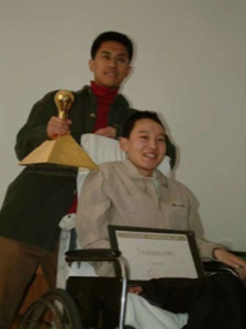 张大诺和第一个指导的残疾学生张云成在一起