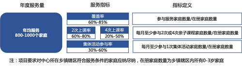 2) 场地配备:项目选择人口聚集的乡镇建设3-7个养育中心,面积总和800-1000平米;对于居住较分散地域的家庭,项目提供家访服务。